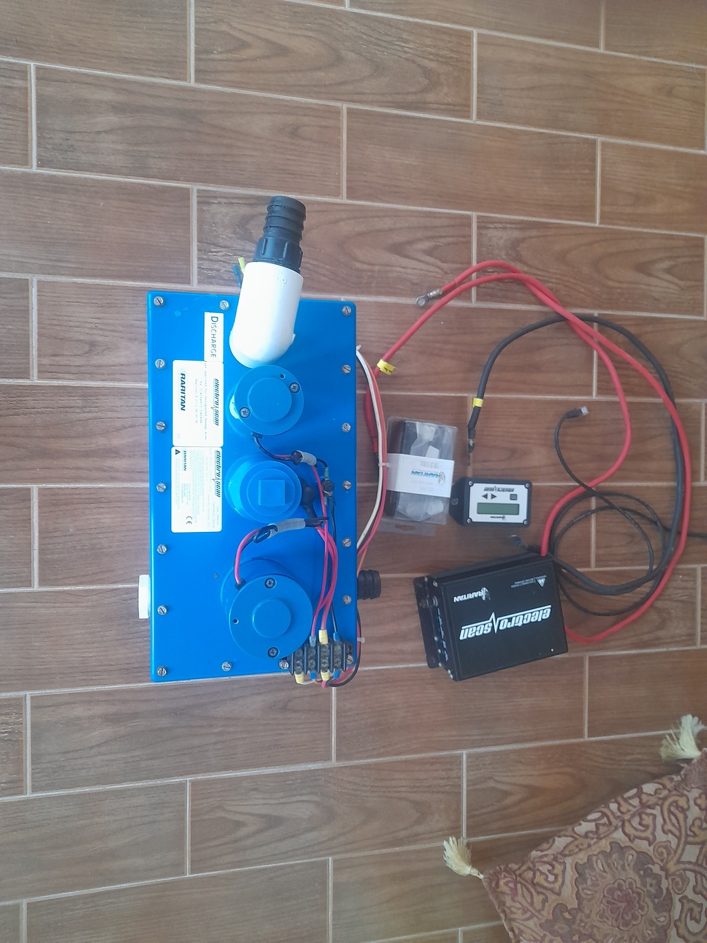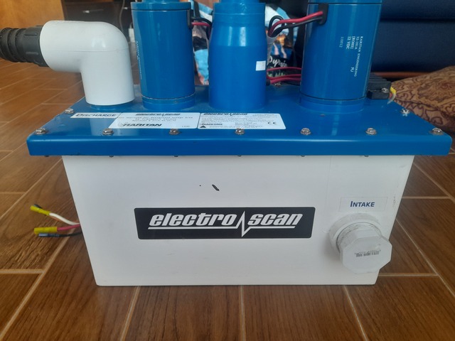 Système de traitement électrolytique des eaux noires pour bateau, marque Raritan, modèle ElectroScan 12 V DC.