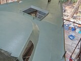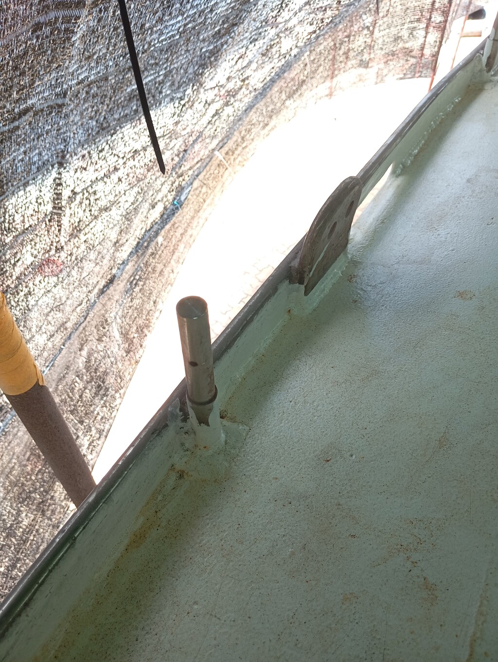 Toutes les pièces métalliques, anciennes et nouvelles, ont été préparées à l'aide de tous les outils mécaniques disponibles (pistolet à aiguilles, gouge Tercoo, meuleuse d'angle, etc.), puis traitées à l'acide phosphorique si besoin, et enfin recouvertes de trois couches de Jotamastic 90.