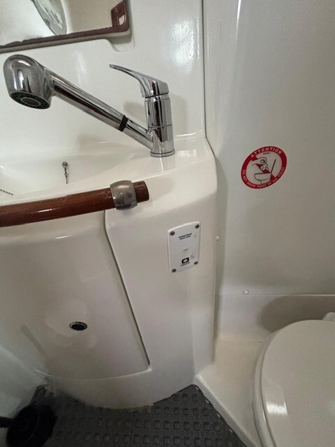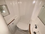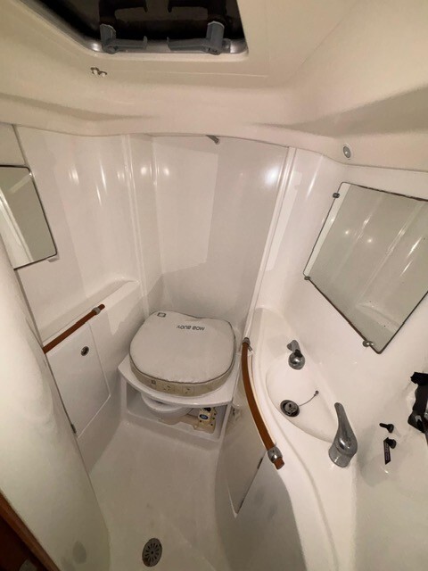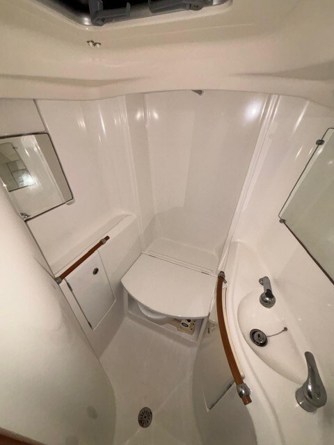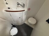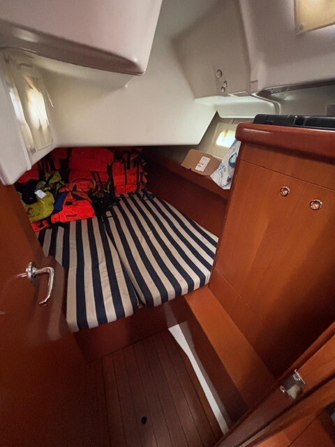 Dans l’arc, Cabine double avec lit à Bâbord, + banquette, servie par une salle d’eau privative.