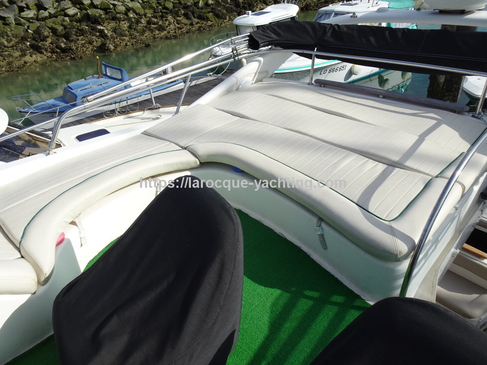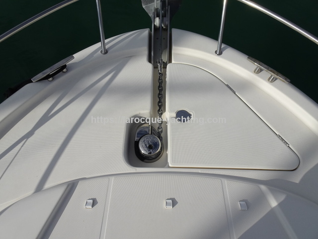 Propulseur d’étrave Max Power. Guindeau électrique Quick (2022). Mouillage principal ancre Delta + 60 m de chaîne + 20 m de câblot. Jeu de coussins de bain de soleil avant. Taud de camping effectué sur mesure, en parfait état. Jeu de coussins de cockpit. Table de cockpit. Pompe eau de mer dans le cockpit. Fond de cockpit latté teck. Echelle de bain. Douchette de cockpit. Plateforme arrière lattée teck. 1 Poste pilotage au fly-bridge. Taud de poste de pilotage. 2 Sièges pilotage et copilotage avec tauds de protection. 1 Bimini sur le fly-bridge. 1 Jeu de coussins de bain de soleil.