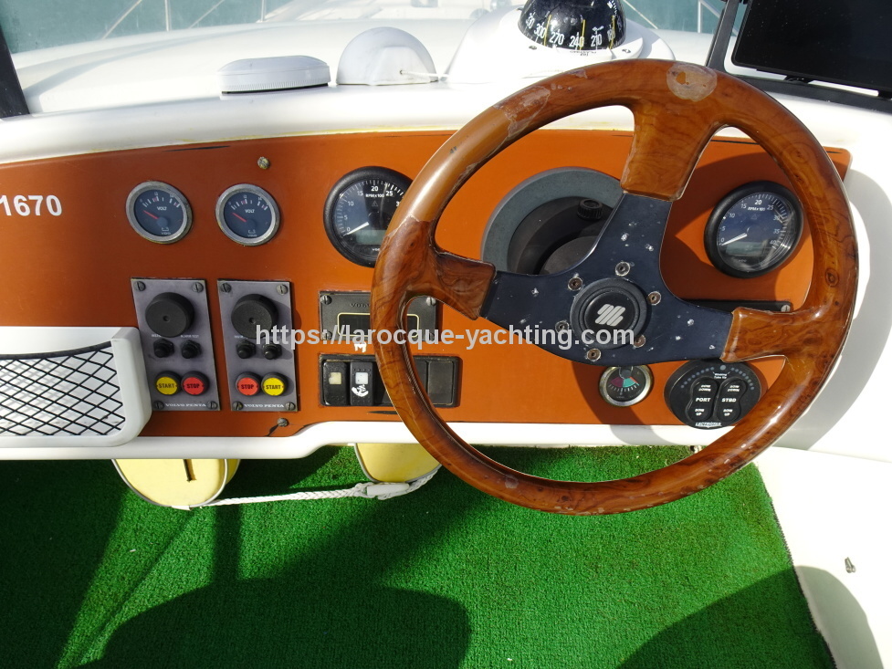 PRESTIGE 36. Superbe unité, parfaitement entretenu. Très gros investissement financier depuis 2022. Moteurs In-bord Volvo KAMD44 de 2*360 cv comptant 1 050 heures de fonctionnement, entièrement révisés en 2022. Propulseur d’étrave. Sellerie en parfait état. Vernis en parfait état. Bain de soleil avant. Bain de soleil au fly. Taud de camping sur mesure. GPS traceur Garmin aux deux postes de pilotage. VHF ASN. Chauffage air pulsé. Climatisation. Bateau qui a bénéficié de très nombreuses améliorations. Visible à La Rochelle. Pour plus d’infos, photos ou organiser une visite, contactez-moi sans attendre !
