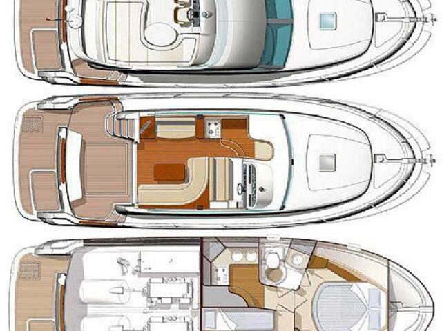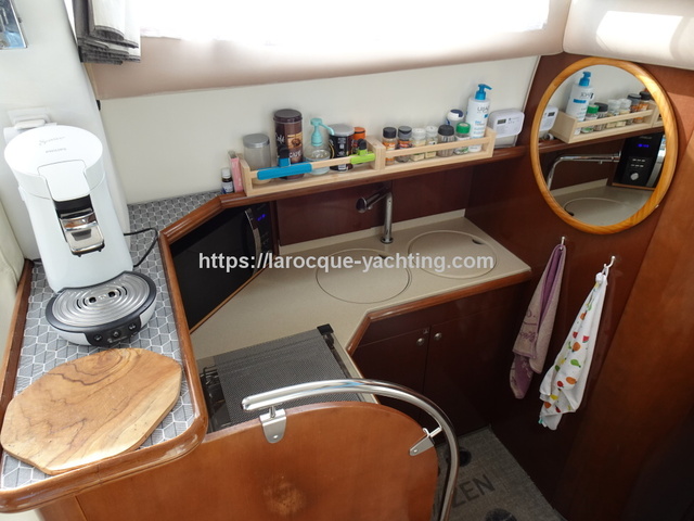 1 Cabine double avant. 1 Cabine double sur tribord, deux couchages simples ou un couchage double. 1 Cabinet de toilette WC marins, douche, lavabo, avant bâbord. 1 Cuisine en long sur bâbord. 1 Poste de pilotage sur tribord. 1 Carré en L sur tribord. 1 Banquette sur bâbord.