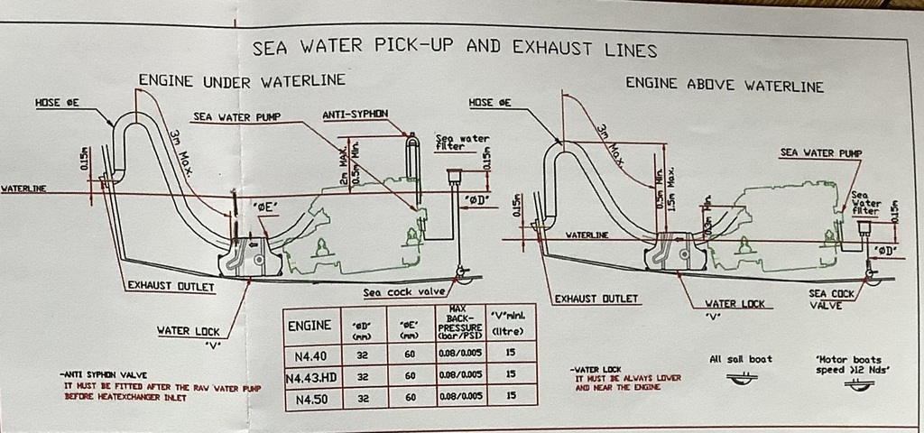 Par ailleurs pour être complet, l’installation ne comporte pas d’anti-siphon conformément au schéma de droite du doc ; le collecteur d’échappement se trouve bien à plus de 30 cm au-dessus de la flottaison, ça semble donc normal. Serait-ce pourtant là le pb ?