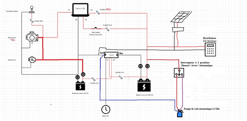 Nota: j'ai fait une erreur sur le précédent schéma , j'ai branché la pompe de cale automatique directement sur les bornes de la batterie Services, empêchant ainsi le BMV712 de mesurer sa consommation !