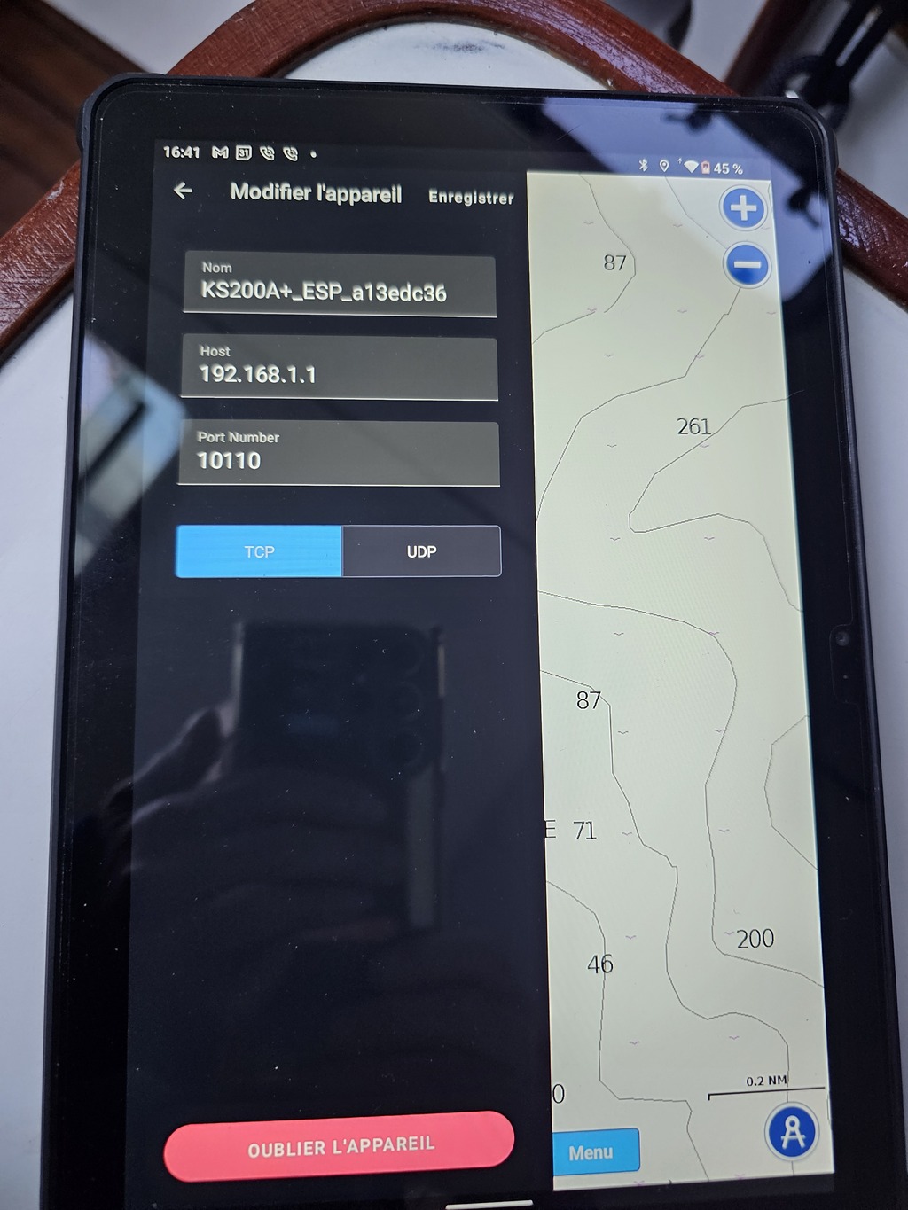 Par contre je n'arrive pas à le connecter sur ma tablette android. Je viens de me rendre compte que dans l'application NAVIONICS le nom de KS200+ ESP_...etc.. n'a pas la même extension ainsi que le HOST qui fonctionne en 192.168.4.1 sur mon telephone et qui apparait en 192.168.1.1 sur ma tablette.