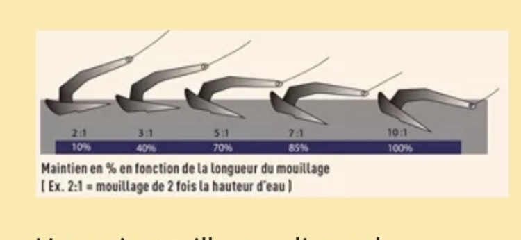 zouip:Pour être précis, avec 2 fois la hauteur d' eau, quand la chaine est tendue l' angle de tire est de 30° : angle = arcsinus de 1/2 (voire plus si on ajoute le franc bord); c' est à dire une valeur très insuffisante pour qu' une ancre moderne s' enfonce·le 30 sept. 14:19
