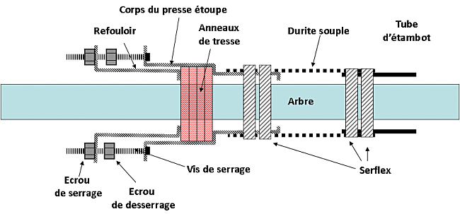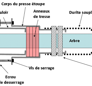on met de la tresse suifée . Je me demande si on en trouve encore dans le commerce . De temps en temps on resserre un peu les écrous parcequ'avec l 'usure la tresse diminue d'épaisseur . Il faut alors la recomprimer .