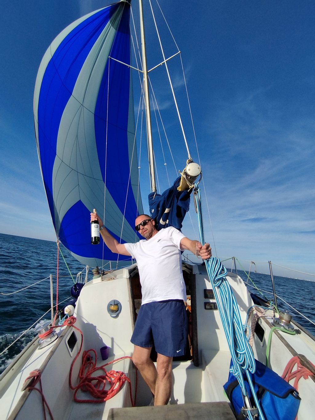 Si vraiment il n'y a pas de quoi gonfler le spi, alors je laisse le bateau sous grand voile seule avec une retenue solide, je branche le pilote et je bois un coup.