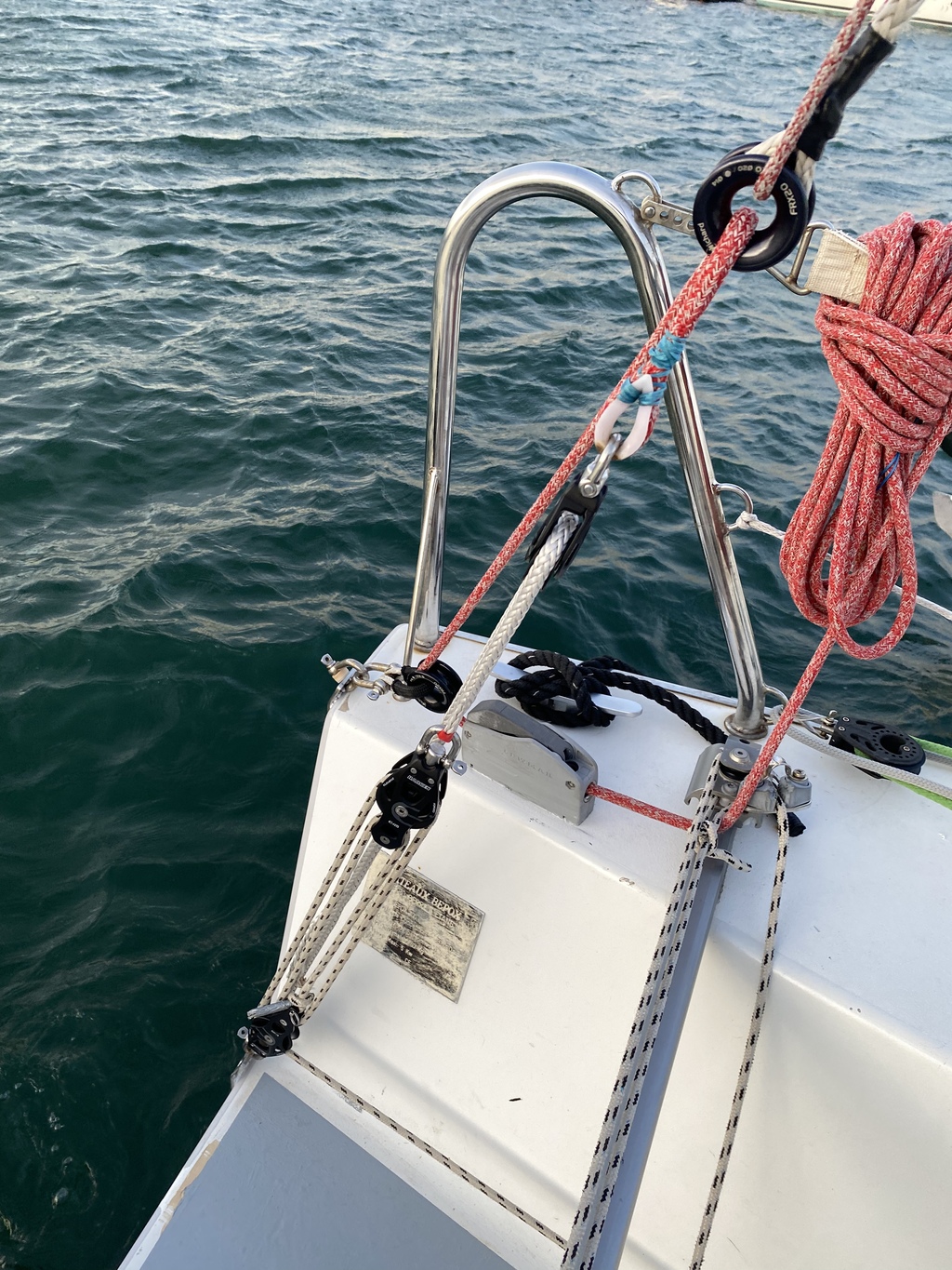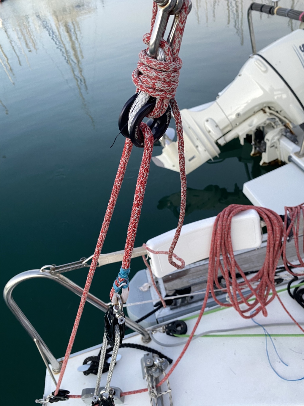 J’ai donc fait passer directement une drisse de 8 avec un anneau de friction et utilisé le bloqueur