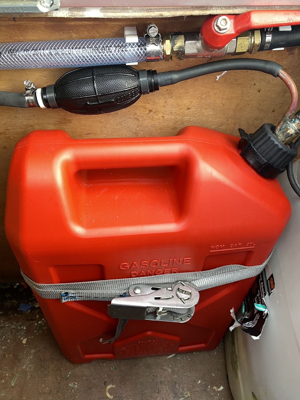 Le tuyau dans le coffre est attaché avec des colliers en hauteur pour ne pas se balader
