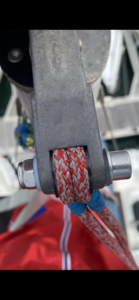 Déjà ma sortie de drisse a un angle trop prononcé il faut que j’ajoute un réa pour tirer plus droit car avec celle la j’ai un chariot tout en haut avec un dispositif pour plier la voile il y a un dyneema qui revient le long du guindant