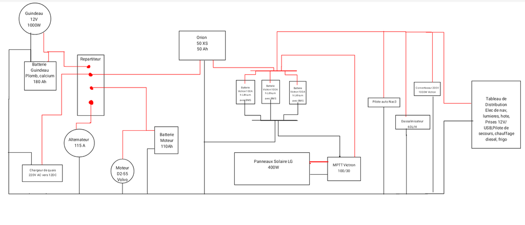 Fabien83:Salut, pour les raisons indiquées plus haut, le branchement de l'Orion sur le schéma de droite n'est pas bon selon moi. Je ferais le schéma de gauche. Dans chacun des schémas, le chargeur de quai ne recharge pas les batteries plomb. Ton chargeur de quai a une seule sortie ? S'il a deux sorties ou plus, je les brancherais sur la batterie guindeau et batterie moteur. S'il n'a qu'une seule sortie, je la brancherais sur l'entrée du répartiteur, là où est branché l'alternateur.·le 15 nov. 07:00