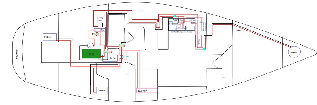 ceci dit voila le final prévu dans le bateau, dans un premier temps le chargeur de quais alimentera le lithium par l’intermedière du DcDc et plus tard je m’attarderai sur son reglage/cablage sur le lithium (on s'en sert presque jamais)