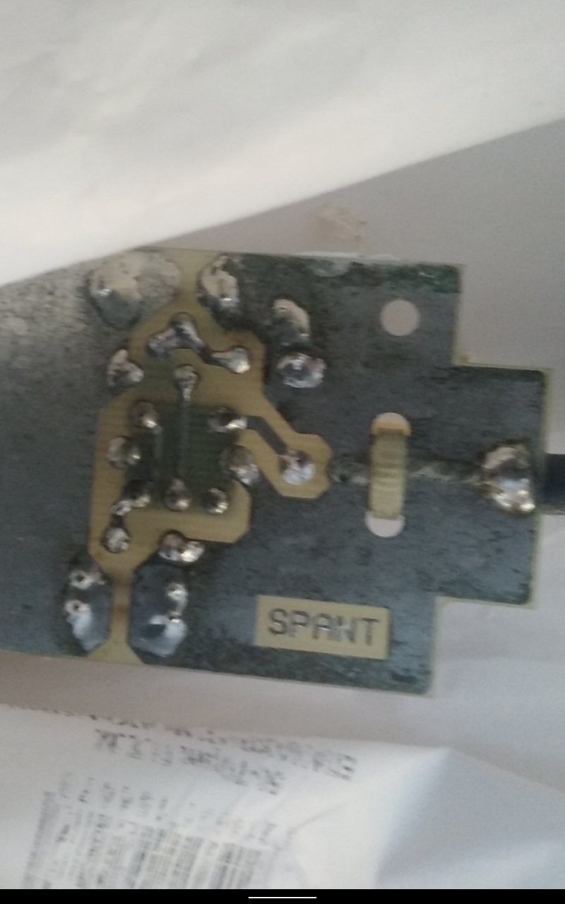 - Lorsque j'ai ouvert l'antenne active, il y avait pas mal de corrosion sur le petit circuit. Je l'ai nettoyée, mais la corrosion a pu faire son chemin à l'intérieur des composants, notamment dans ce "gros" composant cubique (au centre de la photo), dont je présume qu'il fait quelque chose d'important. Qu'en pensez-vous ?