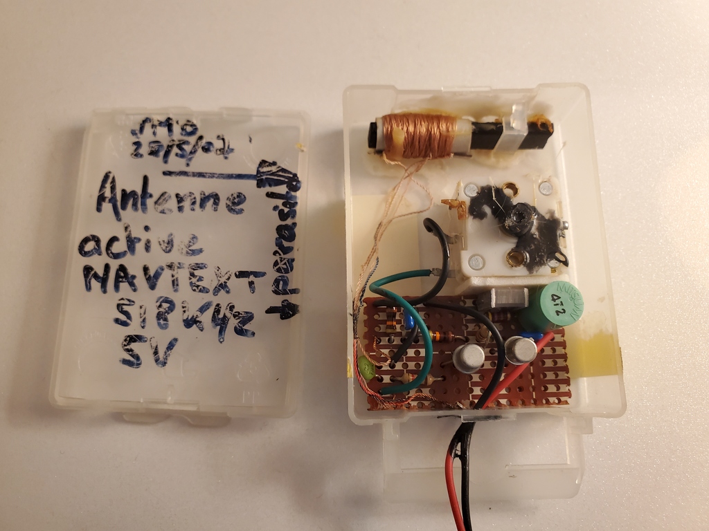 L'antenne amplifiée de ce Navtex amplifie la composante électrique récupérée en sortie du tout petit fil d'antenne (alors que sa fréquence réclamerait une nettement plus grande longueur) plus ou moins accordé couplé avec une bobine (+ condensateur ?) à sa base. pour favoriser l'onde à capter par rapport à tous les parasites). Le coaxial de sortie qui véhicule aussi le courant pour le préamplificateur n'a pas dans cette gamme le comportement que l'on exploite en VHF par exemple.