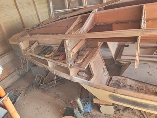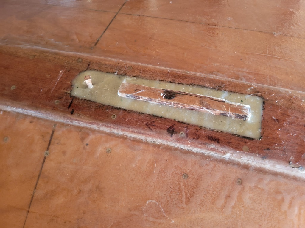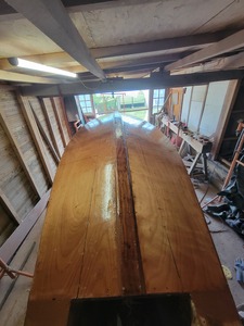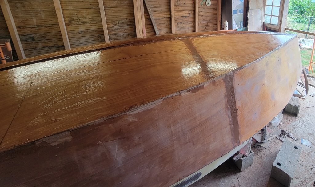 La fausse quille en bois doit être collée (seule, sans le lest en fonte) à la contre quille (donc le fond de la coque) à l'époxy chargé de silice.