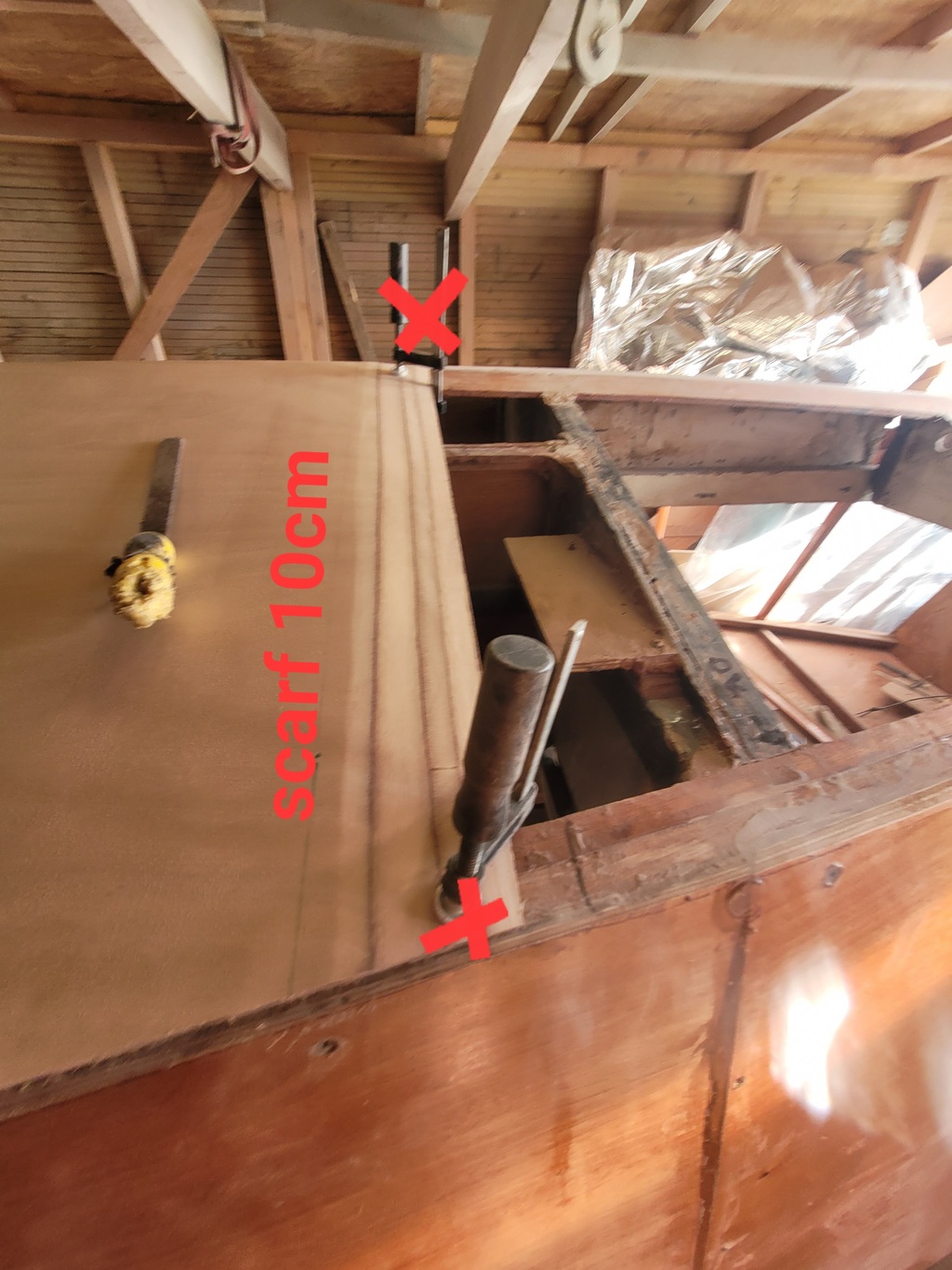 Donc bien sûr cela est déjà fait, j'ai collé la contre quille sur la quille à la résine époxy chargée à la silice. Avec le joli scarf de chaque côté sur les panneaux de contreplaqué ...