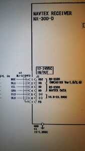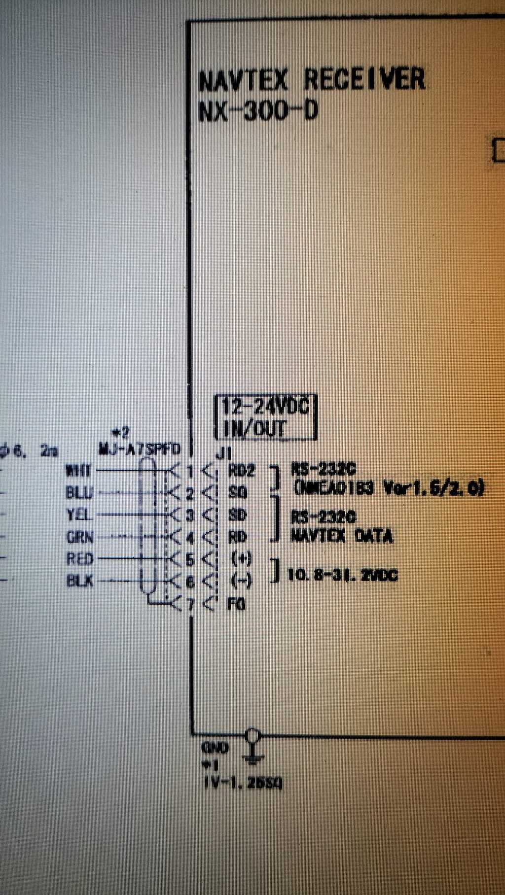 Un aimable voisin de ponton m'a donné un Navtex Furuno NX 300 D pro, en état incertain et sans la connectique. Pour savoir s'il fonctionne, il faut au moins que je puisse l'alimenter et - comme je suis nul - j'ai du mal à voir, dans ce bazar, où connecter le plus et le moins du 12 V (photo). J'ai mis la main sur un schéma mais ça ne m'avance pas beaucoup, les couleurs ne correspondent pas.