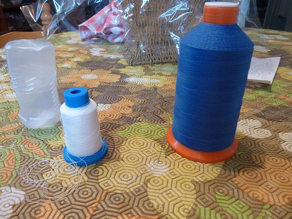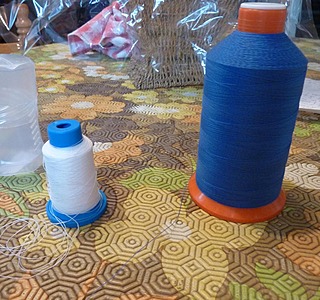 Pour des réparations, j'utilise du fil polyester transparent résistant aux UV, aiguille 100 ou 110. Pour la couture de tissu Sunbrella, j'ai acheté du fil bleu spécial couture intempéries chez bruneel et des aiguilles 120. Malheureusement ce fil ne passe pas dans ma Pfaff pourtant de très bonne qualité. Il me faudra une machine professionnelle si je veux faire du beau travail.