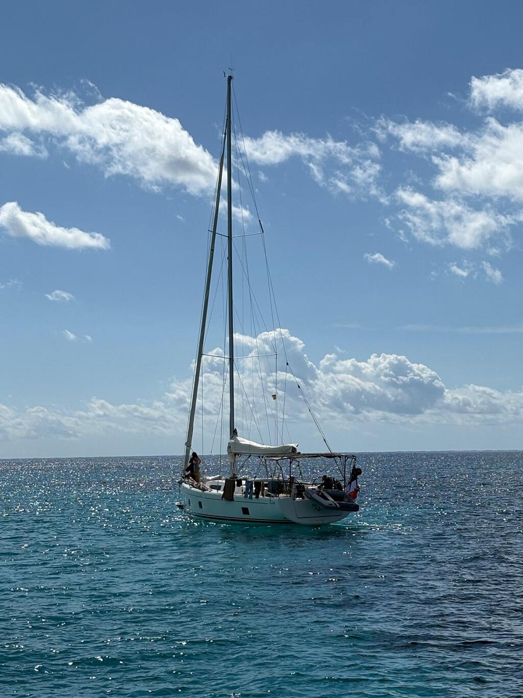 Voilier monocoque de 12 m - coque blanche et genaker bleu ciel - immatriculation provisoire du navire W24648 - 3 personnes à bord - bon niveau de navigation.