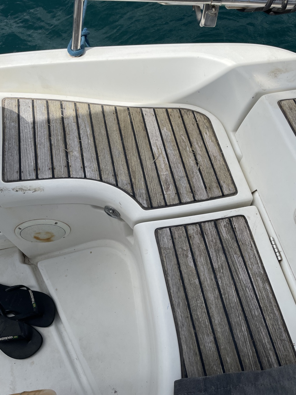 J'avais refait moi même les bancs en teck de mon 31.7 . Ils étaient usés et se décollaient. Le plus long est de tout décoller si possible sans les casser pour avoir le gabarit des nouveaux. Le collage des nouveaux n'est pas très compliqué. Ça s'achète tout fait avec les joints entre les lattes. Il n'y a plus qu'à découper, coller et faire les joints autour. Ça donne un sacré coup de jeune à ton bateau.