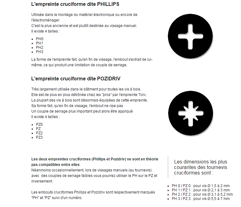Pour les cruciformes, il faut prendre le tournevis qui va bien (Pozidrive ou Philips) et ne pas inverser.