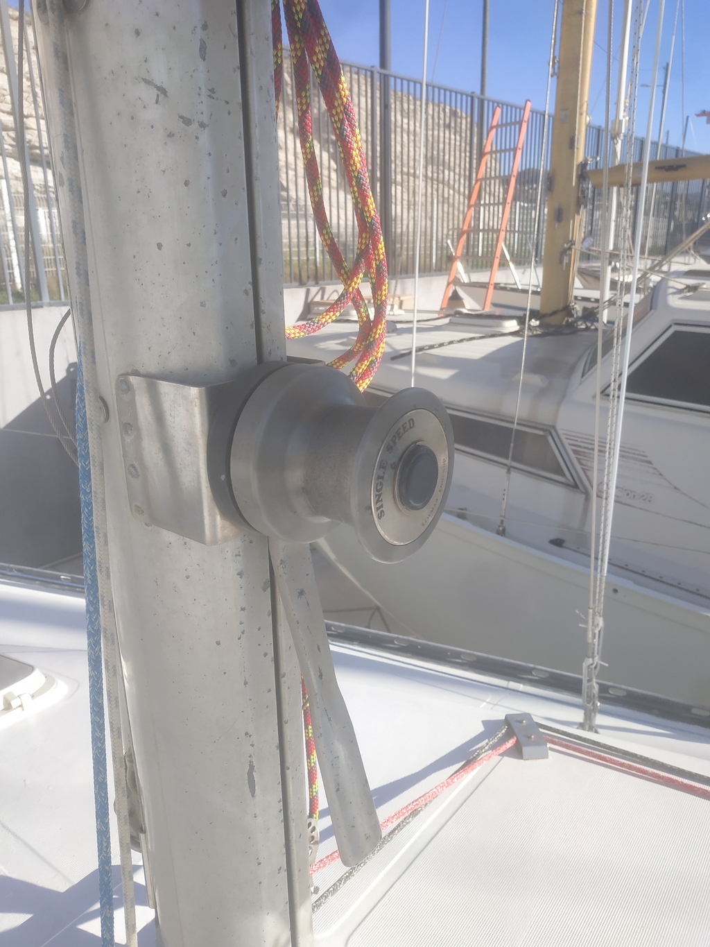 Sur mon (vieux) Kelt 7.60, j'ai un winch (probablement d'origine, 1980) sur le mât avec une manivelle intégrée : on ne voit pas très bien sur la photo (je vais en refaire une autre) mais il y a un bras en dessous du winch qui sert de manivelle.