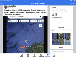 Peace and Love:Orca attack Monday 13th of October , location N43°31.56 W009°08.19Very fast attack, early morning in the dark, West of Ferrol, approximately 17 miles offshore. Motoring, 6kn, just one engine. The attack was not seen but 2 large thumps were heard on the hull in very quick succession. No Orcas were seen. We lost control of the steering immediately. There was no water ingress and after 15 to 20 minutes of observing the boat condition we decided to continue motoring 10 hours south to Vigo for boat repairs. During the 10 hours we were able to stop in calm waters and dive to inspect the damage on the rudders ourselves. We discovered that both rudders had been taken clean off. The substructure remained and appeared undamaged. Our suspicion is that we were attacked by two Orcas in synchronisation as the bangs were very close together. We arrived safely in Vigo no further issues. Boat Fontaine Pajot Astrea 42 Catamaran crew all safe and sound.·le 14 oct. 18:14
