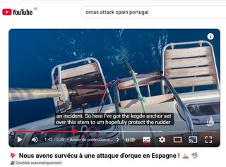 PierMi:Cela reste hypothèse et je ne l'ai plus vue débattue dans des études scientifiques récentes. Mais elle reste séduisante à plus d'un titre. En prémices, tout le monde est d'accord pour reconnaître les capacités phénoménales d'apprentissage des orques et que rien ne ressemble plus à un ventre de thon de 2m/3m suspendu verticalement à sa ligne qu'un safran. L'Idée séduisante d'abord parce que le comportement "déviant" constaté est issu d'une interaction productive avec ...l'homme et en aucun cas tournée contre l'homme. Ensuite, parce qu'elle ne concerne qu'un nombre limité (8/50) d'orques identifiées car "bien connues des nos services": les scientifiques leur ont attribué un prénom. Pour finir, parce que les seuls juvéniles -certes accompagnés- y développent cette attitude. Je prends donc le parti de penser que ce comportement disparaîtra avec l'âge. En attendant, d'accord pour les passer comme dit @Peace and Love et donnons du temps au temps en choisissant judicieusement -et pas judiciairement- les créneaux de passage comme dit @Shari, créneaux qui semblent du reste favorables à ceux qui veulent faire la grande traversée. Quant à moi, petit côtier trimbalable sur roulettes, je sais déjà que temporairement, je ne mettrais plus les safrans dans ces eaux-là en juillet-août.·le 19 oct. 08:28