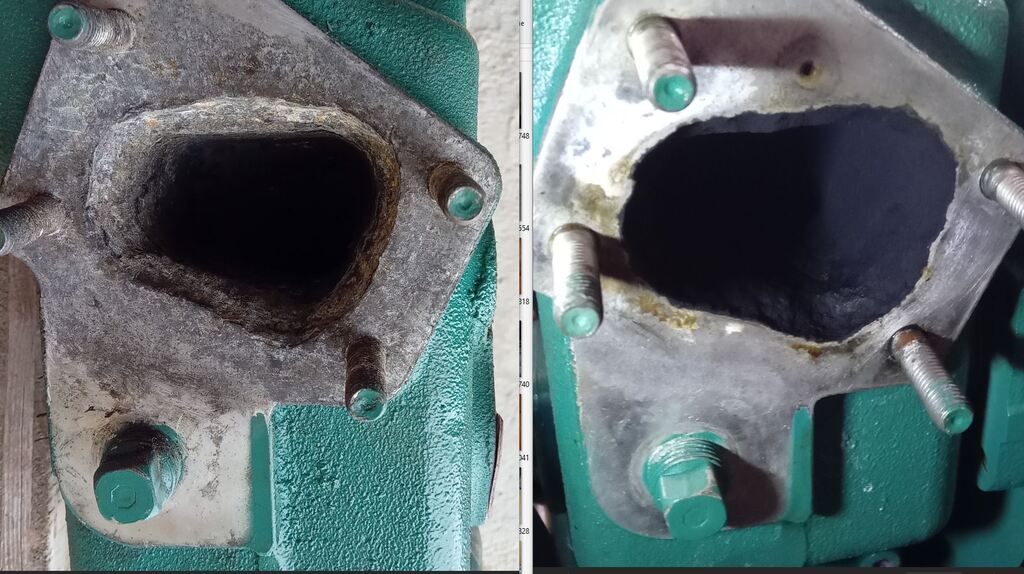 Puisque l'échangeur est maintenant déposé, je me pose la question de faire recharger la sortie d'échappement de façon préventive. D'après un précédent message il semble que la corrosion continue même en ayant remplacer le joint inox par une autre matière. Sur mon moteur qui a fonctionné environ 1000h avec le joint d'origine puis environ 500h avec un joint fibre fournie par "part4engine", j'ai l'impression que ça n'a pas évolué. La photo montre le constat après 1000h à droite et l'état actuel après 500h de plus à gauche.