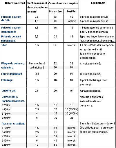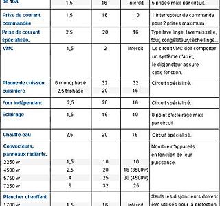 Donc du 1,5 mm² pour raccorder des lampes, des prises de bases le tout sur un disjoncteur 16 A et du 2,5mm² pour raccorder des équipements lourds: plaque à induction, chauffage électrique à un disjoncteur 16 A aussi.
