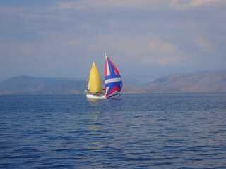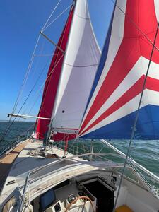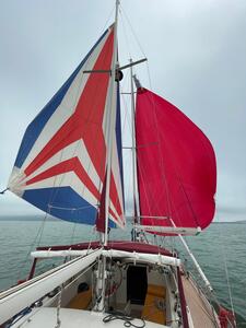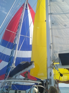 Toutefois, il m'arrive de l'envoyer quand les conditions s'y prêtent (plus de 12 noeuds de vent réel a 150/170 degrés, je le garde hissé plutôt haut, pour ne pas être trop emm... ça ne va pas beaucoup plus vite mais ça fait de belle photos et c'est bien dans l'esprit des années 70