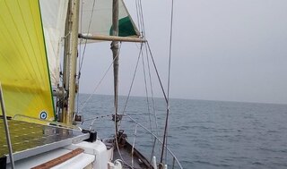 Comme quoi même un bateau lourd peut avancer dans les petits airs : il suffit d'envoyer 220 m2 de toile...