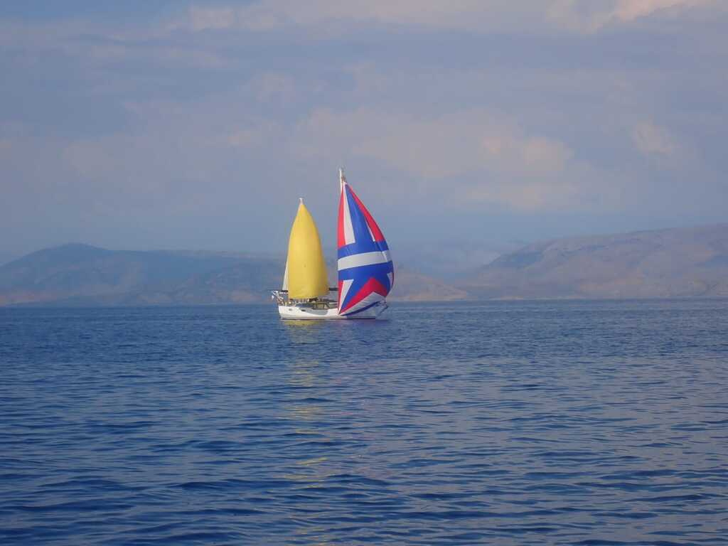 Grand spi + spi d'artimon (un spi de grand surprise) + artimon = 3,5 nœuds au grand largue dans quasiment rien d'air (les spis tenaient à peine si on abattait trop), entre Corfou et le continent. On était (quasi) les seuls à la voile, on nous prenait en photo ! Pourtant on n'est pas un ULDB : coque acier de 18 tonnes pour 14m. Carène propre, dérive relevée, mais grosse tripale fixe. Mer plate.