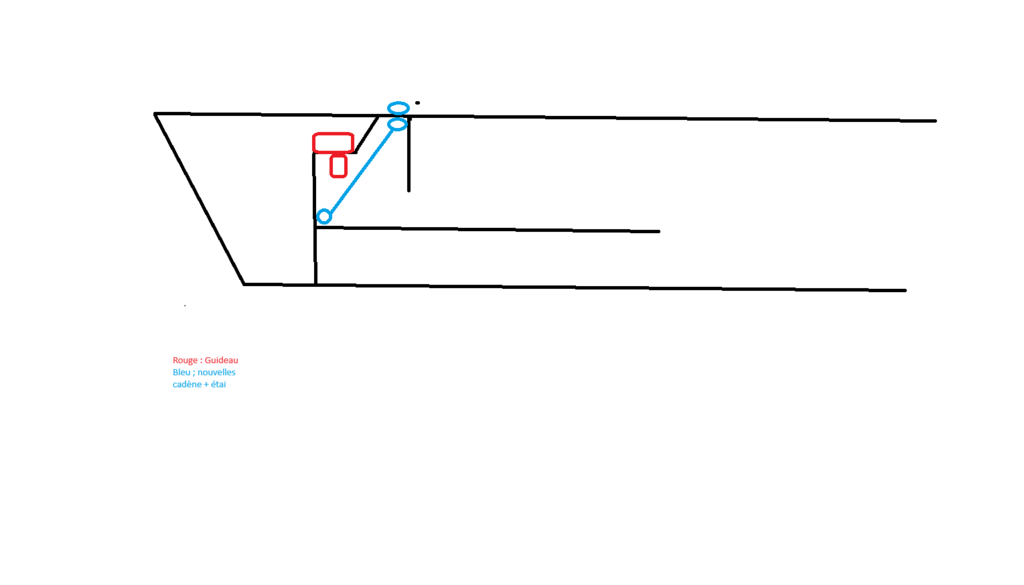 La cadène de hale bas avait été retiré, les boulon de cette cadene étant traversant, une cadène plus grosse sur le pont et une seconde cadène avait été fixé sous le pont (boulon prenant le pont en sandwich) permettant ensuite de fixer un hauban entre cette cadène sous pont et la cloison forte de la bail a mouillage pour reprendre les efforts. Voici un dessin j'espère que ca sera plus claire.