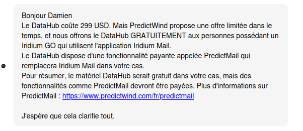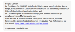 Bon , 'ai eu la réponse que j'attendais : si je prends Predictmail, (120$ USD/an) le boitier Data Hub est offert (normalement 300$). À partir du moment où ce boiter est offert c'est raisonnable pour le budget, donc je vais partir sur cette solution. Mais je ne comprends pourquoi Predictwind impose ce matériel alors que les concurrents se passent de hardware ce qui est une source potentielle supplémentaire d'emmer... :s