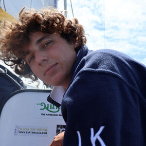Un très jeune candidat français, Louis Kerdelhue, 20 ans, sur un bateau connu, NURI, un ketch Biscay 36, actuellement amarré à La Trinité.