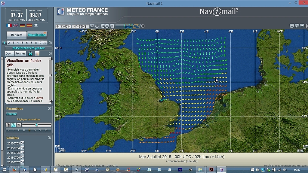 • Pour les courants généraux, par le logiciel Navimail2 de Meteo-France (le pire interface que je connaisse, une HONTE), gratuit, en grib, sur le monde entier, 1 fois par jour à 0 UTC de 24 à 192 h, mais près des côtes, influence des courants de marée à cette heure ! lisible par OpenCpn, évidemment pas de routage possible.