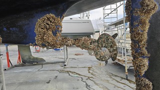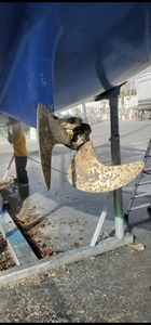 Ça y est. Mon première carénage est arrivé. Mon hélice très abîmée. L'anode complètement partie. Je ne sais pas trop comment remettre en état