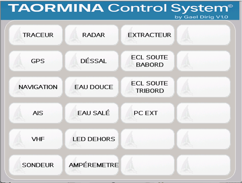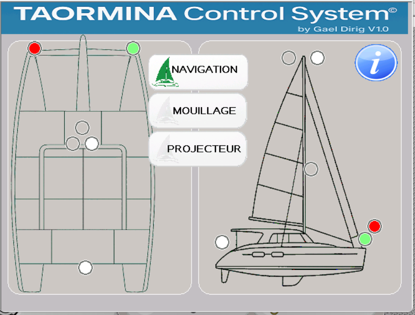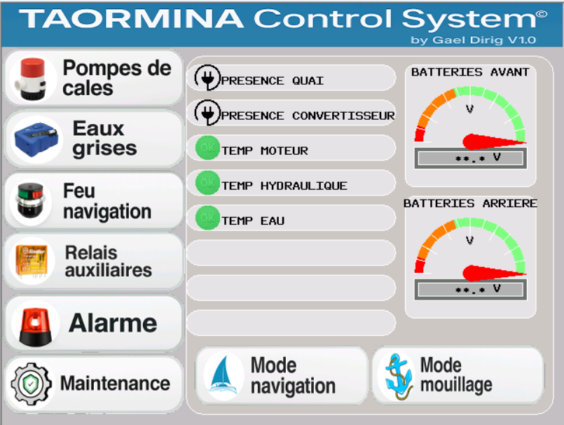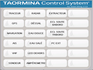Pour notre nouveau bateau j'avais commencé la réalisation d'une interface tactile pour gérer le bord de manière similaire, façon domotique. Ma première constatation a été qu'il faut absolument que le système soit débrayable pour repasser immédiatement en mode manuel classique avec des interrupteurs et des voyants traditionnels.