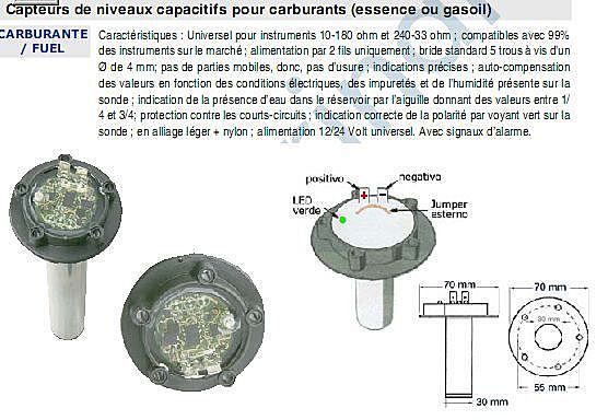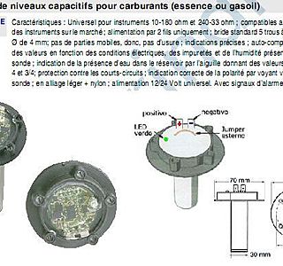 Pour en revenir à cette fichu sonde capacitive, c'est la même pour du VDO ou d'autres jauges. Simplement, ils disent sur le mode d'emploi de couper un petit strap (qui dépasse du moulage epoxy) lorsqu'on la connecte à du VDO (avec en prime une procédure de reconnaissance).