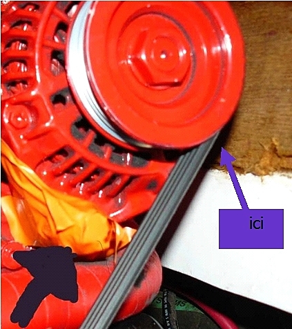 je joint une photo... le boulon est sous le scotche orange ( quand ca casse il permet de retenir la tête de boulon, cette derniere a deja eu l'idée d'aller rendre visite a une poulie de la courroie et là ça la poulie s'abime).