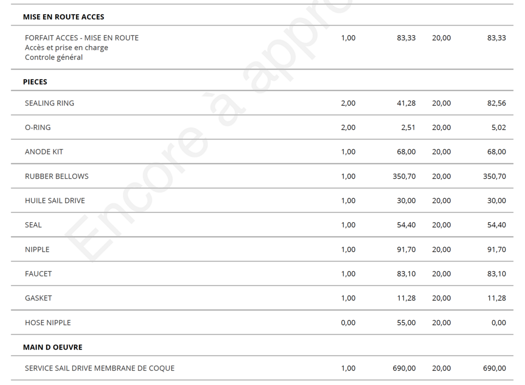 2600€, ça comprends la main-d'oeuvre, le kit membrane, les anodes, le kit d'isolation électrique du saildrive, et le remplacement du damper sur le volant moteur, filtre à air, huile du saildrive.
