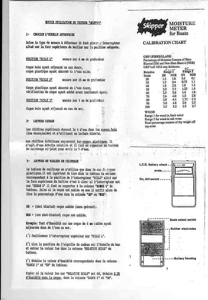 Ci joint le mode d' emploi du Tramex Skipper (Ancien modèle). L' échelle 1 mesure en principe sur 6 mm de profondeur, l' échelle 2 sur 15 mm. En pratique l' échelle 2 détecte facilement à 30 mm, voir plus.