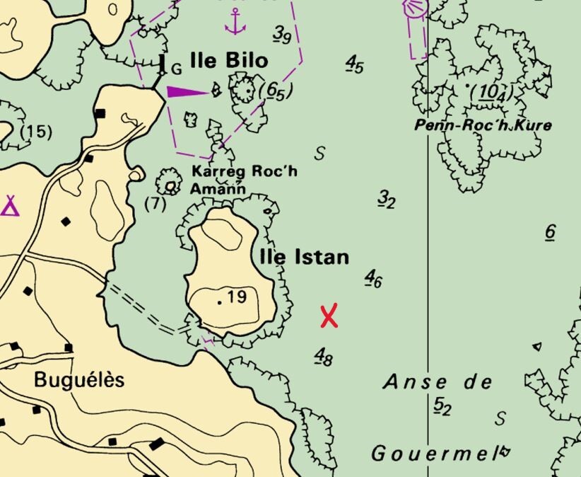 Je rajouterai au commentaire de Red Sky que le caillou n'est indiqué que par les cartes sauf Navionics. Mais ça fait longtemps que je dis qu'il ne faut pas utiliser ces cartes dans les coins. Entre les erreurs d'horaire de courants, de marée et manque de précision des cartes. Au moins cette fois ci, j'ai un exemple concret.