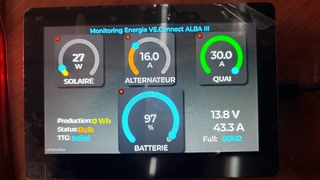 Cet écran donne donc la production solaire (Smart Solar), celle du moteur (Orion XS) et du chargeur de quai (IP22) ainsi que la SOC de la servitude (BMV712). Plus d'autres données de bases comme l'autonomie en durée ou le temps jusqu'à charge complète.