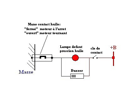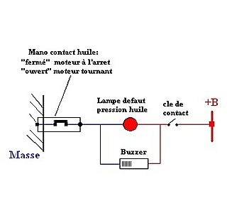 Ci joint le schéma électrique de mano contact de baisse pression huile: Ici le contact du mano est fermé, donc si tu fermes la cle de contact pour démarrer le moteur, le mano étant fermé , la lampe témoin rouge "défaut baisse pression huile " s'allume et le buzzer sonne.