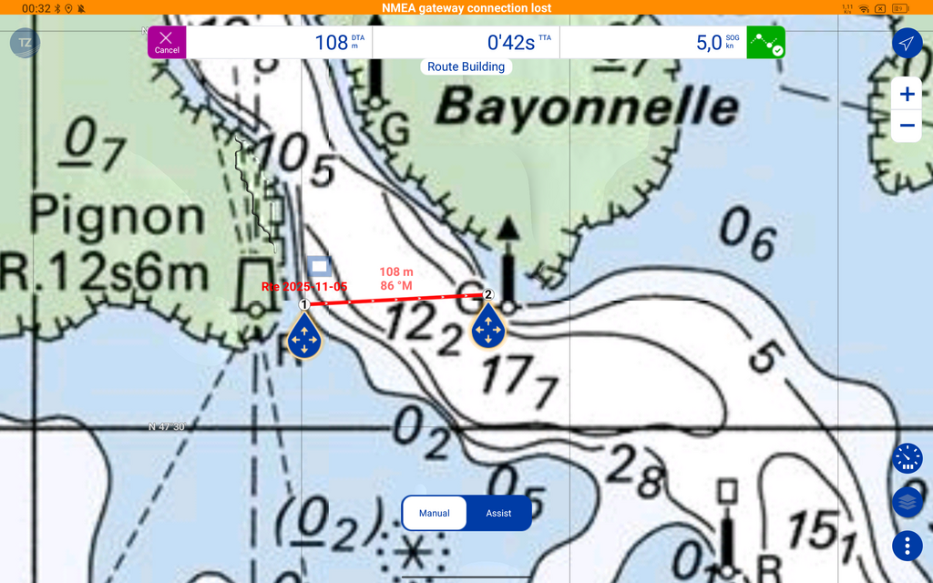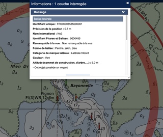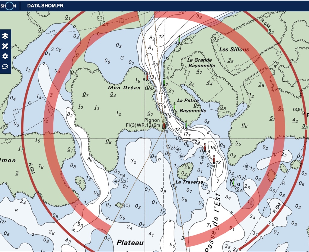 La balise tribord est géolocalisée à 0,5m près, la tourelle rouge bâbord "Pignon" est positionnée sur la carte à 0,7m de précision.