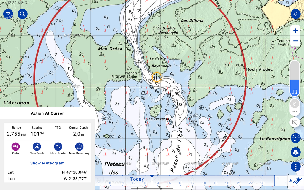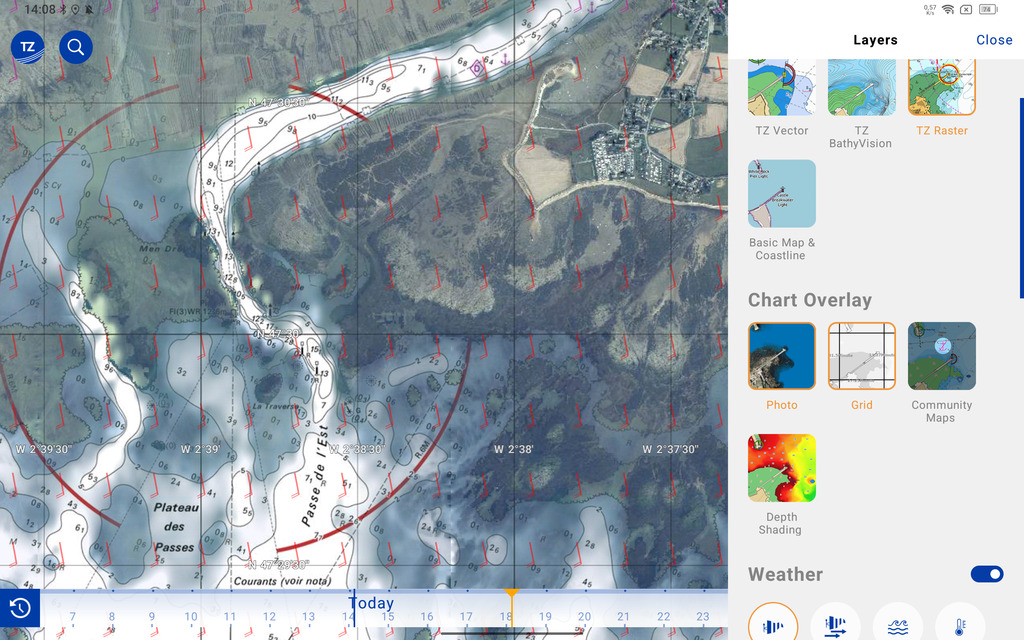 J’apprécie l’ergonomie et la possibilité de changer de vectoriel à raster en un clic. C’est aussi super de pouvoir y superposer la météo et les images satellites (banc de sable pour le mouilage).