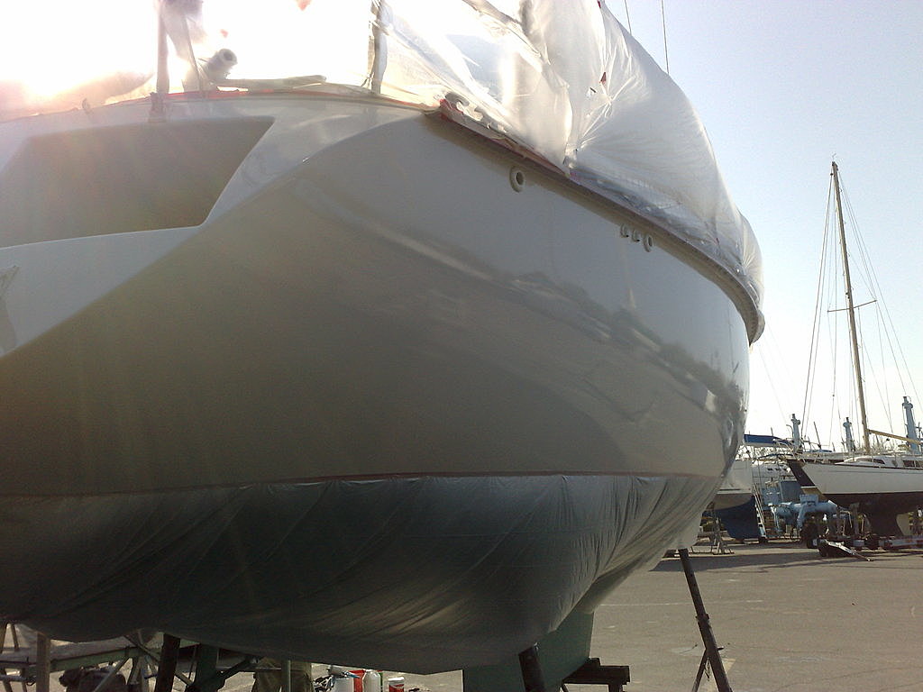 Cela paraît logique, j'ai quand même eu de bons résultats sur un CAPRICE puis sur un AQUILA au rouleau, fini au spalter. Le KELT, on l'a fait à l'airless, ben quand même, il n'y a pas photo. Enfin si, en dessous. Tiens, le mauvais photographe a pris le CAPRICE avant de décacher la bande de flottaison, c'est malin. Ce serait maintenant, je l'aurais faite à l'adhésif.